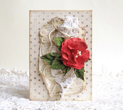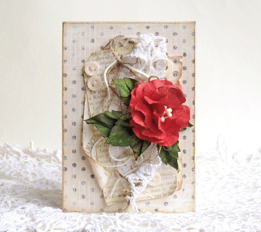 Материалы: картон, бумага для скрапбукинга MF и Pink Paislee, хлопковое кружево, вощёная и льняная нити, металлические скобки, пуговицы, самодельный цветок и листья (рисовая бумага, фатин, тычинки, бумага для пастели, акрил, чернила-дистресс).